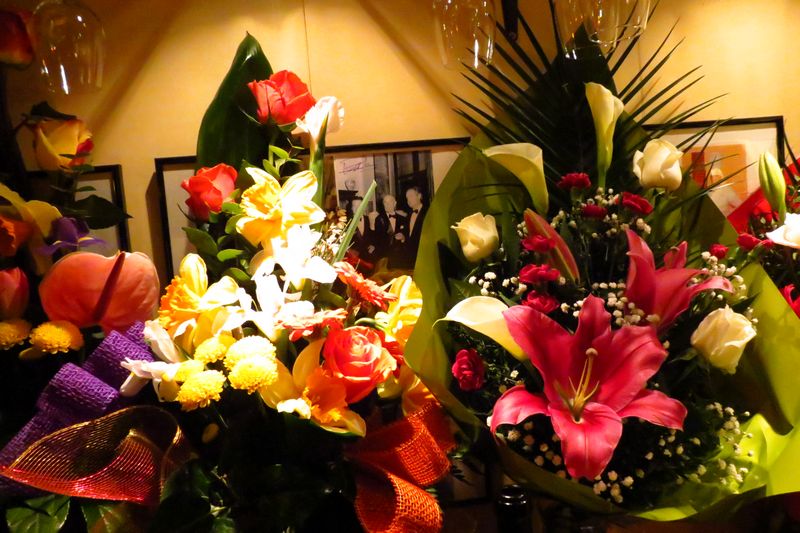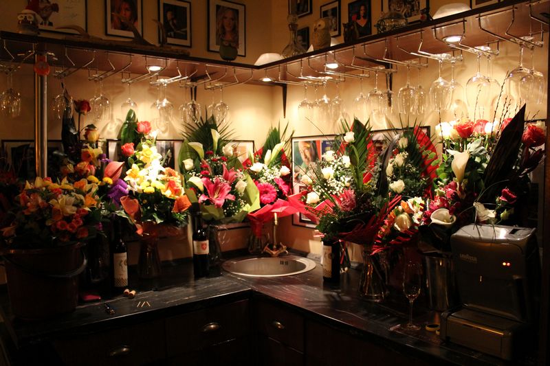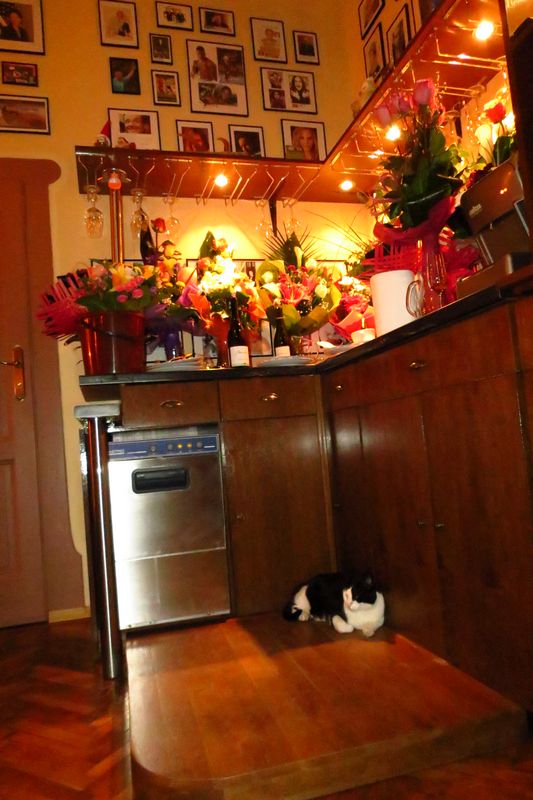 Paula și Tina, prietenele noastre cele de toate degustările, călătoriile, nebuniile, au ținut să-și petreacă zilele de naștere în odăile bunicii. După ce am pregătit vinurile, alese cu grijă chiar de sărbătorite, clubul a început să se umple de flori minunate, de toate culorile și parfumurile. Buchetele abia au încăput în frapiere și căni, ocupând barul și îngemănându-se cu paharele pultului. Așa se face că sticle de Știrbey, Bauer., Avincis, LacertA și Foss Marai au șezut frumos printre trandafiri, lalele, iriși, narcise, crini, gerbera ș.a. Ba chiar și Lucky Motanul, emblema în carne și oase a clubului, a ținut să participe la eveniment, găsindu-și loc la rându-i undeva la baza barului, sub florile și sticlele de tot felul.
