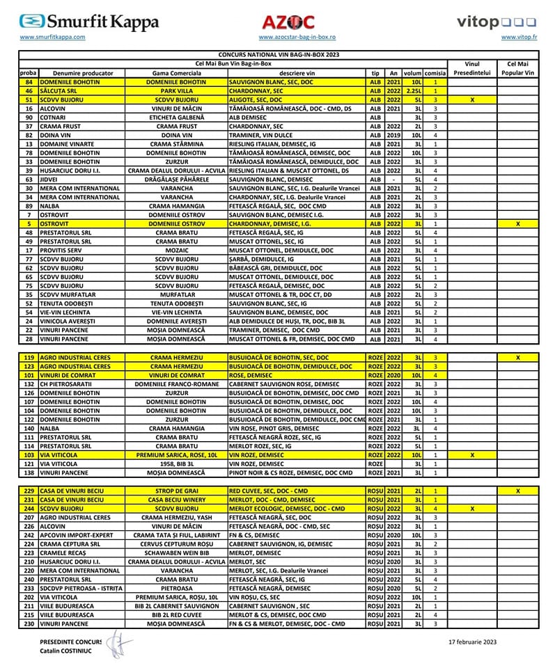 Cele 60 de vinuri câștigătoare ale titlului de CEL MAI BUN VIN BAG-IN-BOX 2023 au fost degustate din nou de juriul pentru CEL MAI POPULAR VIN BAG-ÎN-BOX, format din 35 de membri împărțiți în două comisii coordonate de Daniel Vranescu, de la Cotnari, și Corina Loredana Moroianu, de la Vinuri de Măcin.