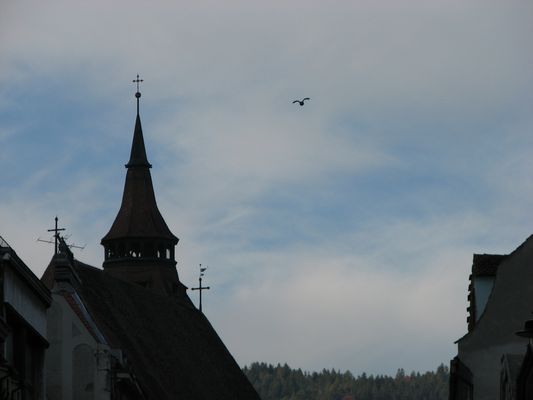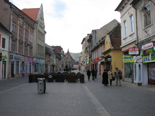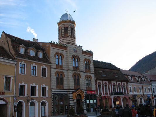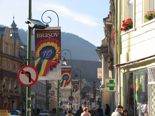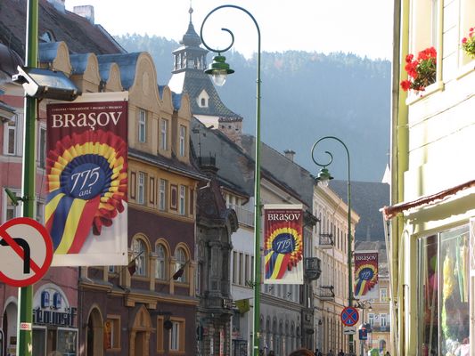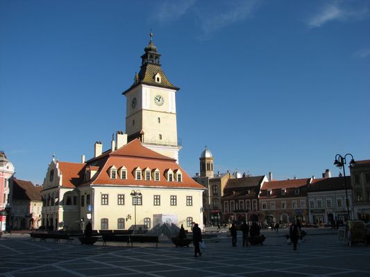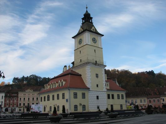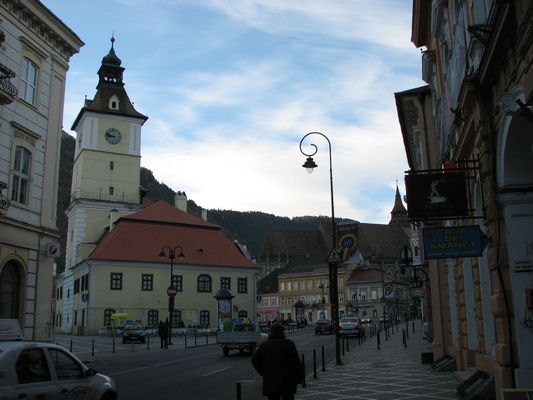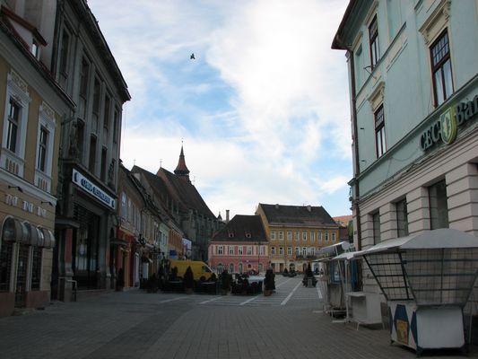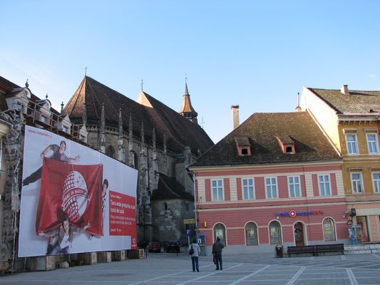 Aveam la dispoziţie cam două ore, aşa că am ales o plimbare până la Piaţa Sfatului şi Biserica Neagră. După o scurtă oprire la Coffe Back pentru o cafea, sandwich şi croissant cu cremă de marţipan, am pornit spre Biserica Neagră, construită în secolele XIV-XV, puternic afectată de marele incendiu din 1689. Lucrările de renovare au durat 100 de ani, iar denumirea bisericii provine de la culoarea zidurilor după incendiu. Pe unul din contraforturi se află o statuie reprezentând-o pe Fecioara Maria, patronul spiritual al oraşului, cu faţă îndreptată spre Piaţa Sfatului. Piaţa atestată din 1520 sub numele de MarkPlatz (se ştie totuşi că din anul 1364 aici avea loc târgul anual de produse la care veneau negustori de peste hotare) este emblema oraşului. În piaţă a exisat cândva stâlpul infamiei unde erau judecate vrăjitoarele şi a fost decapitat, în 1688, Ştefan Stener, şeful breslei cizmarilor, pentru că s-a opus intrării austriecilor  în oraş. Cea mai importantă clădire este Casa Sfatului, vechea primărie, construită la 1420 şi care acum găzduieşte Muzeul de Istorie. În plimbarea noastră matinală am admirat faţadele renovate cu gust, păstrând armonia culorilor şi punând în valoare ornamentele vechi ale clădirilor. Am remarcat o unitate a culorilor geamurilor şi intrărilor, fară termopane de toate nuanţele, pesemne că edililor le pasă de oraşul lor. Braşovul este un oraş curat şi ordonat, o veritabilă moştenire săsească, iar obiectivele turistice sunt bine semnalizate prin indicatoare.
