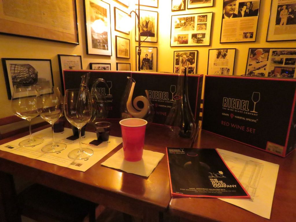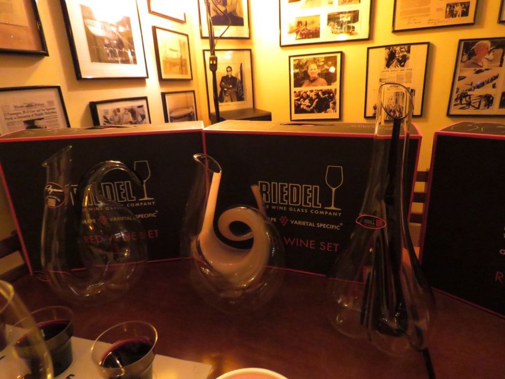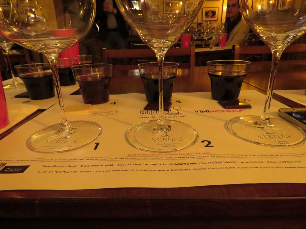 Pentru seara de sâmbătă, cunoscutul promotor al vinurilor Vinimondo ne-a propus o inedită degustare în pahare Riedel, însoțită de trei produse: apa, vinul, ciocolata. După un ritual interesant, pe care neofiții și visătorii l-ar situa la limita magiei iar inginerii l-ar tălmăci răsfoind cărți de mecanica fluidelor și biochimie, Vali ne-a demonstrat elocvent cum poate influența forma paharului percepția asupra soiului de vin degustat. Folosind criterii științifice, Riedel, prestigios producător de recipiente destinate servirii vinurilor (pahare și decantoare), a elaborat mai multe tipuri de pahar potrivite savurării unor anumite soiuri de vin. Noi ne-am bucurat, având în față cantități fixe de vin (125 ml) și fix șapte pahare, patru de plastic destinate debarasării ori măsurării volumului, și trei marca Riedel, destinate soiurilor Pinot Noir, Syrah și Cabernet Sauvignon.